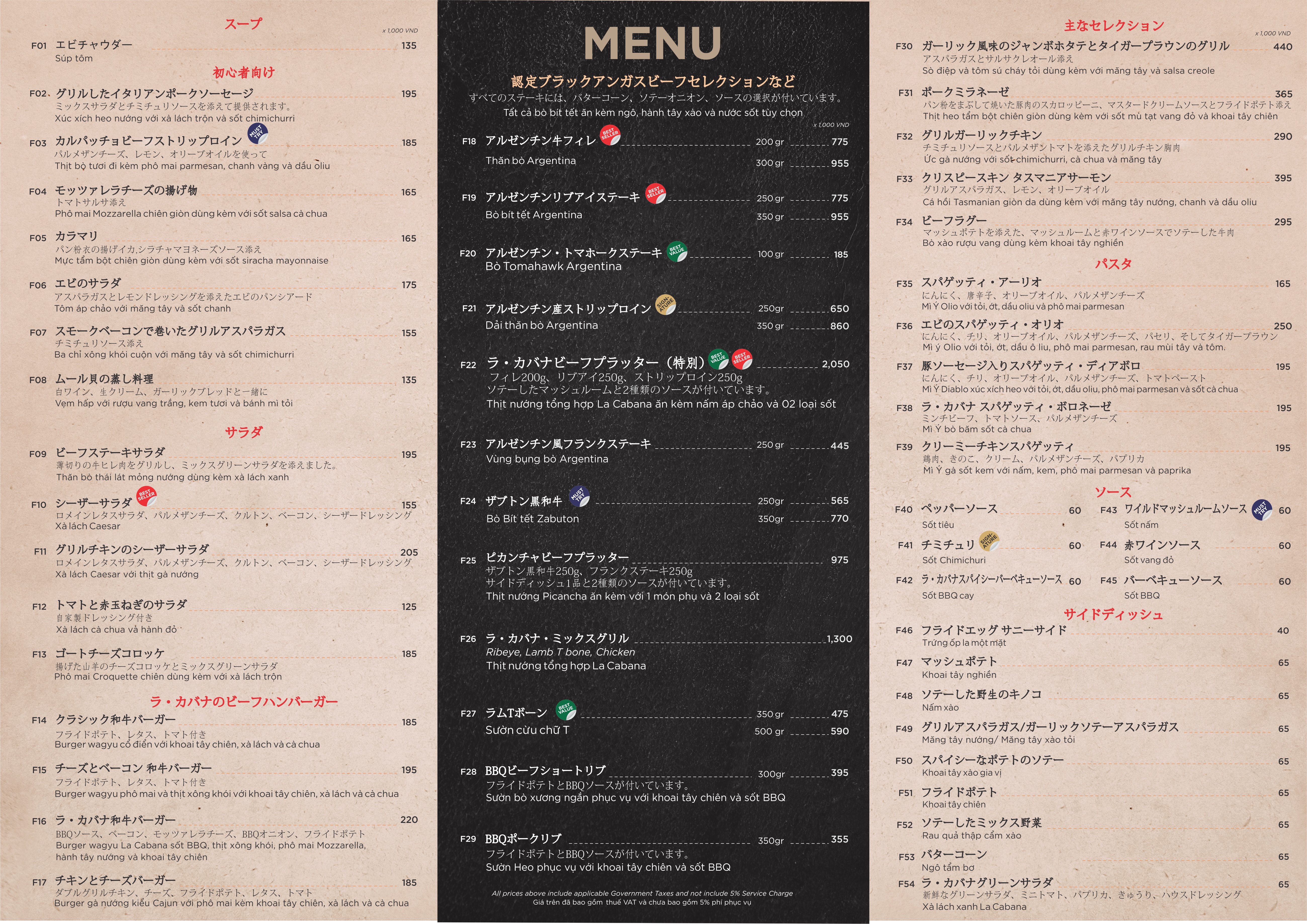 Nhà hàng chúng tôi có đa dạng các loại món ăn với hương vị ẩm thực Argentina. Tất cả thịt đều mềm, mọng nước và được nấu một cách hoàn hảo. Bên cạnh các loại thịt bò thượng hạng, chúng tôi còn phục vụ các loại thịt, sườn heo, cừu và các loại hải sản cùng với các loại salad tươi ngon và không thể kể đến món bánh mì tuyệt vời.